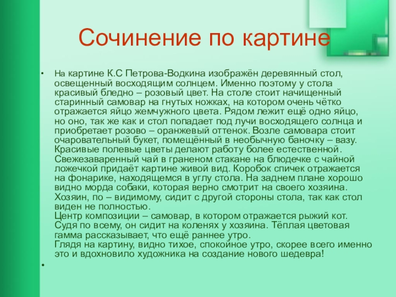 солнцем. Именно поэтому у стола красивый бледно – розовый цвет. На столе стоит начищенный старинный самовар на гнутых ножках, на котором очень чётко отражается яйцо жемчужного цвета. Рядом лежит ещё одно яйцо, но оно, так же как и стол попадает под лучи восходящего солнца и приобретает розово – оранжевый оттенок. Возле самовара стоит очаровательный букет, помещённый в необычную баночку – вазу. Красивые полевые цветы делают работу более естественной. Свежезаваренный чай в граненом стакане на блюдечке с чайной ложечкой придаёт картине живой вид. Коробок спичек отражается на фонарике, находящемся в углу стола. На заднем плане хорошо видно морда собаки, которая верно смотрит на своего хозяина. Хозяин, по – видимому, сидит с другой стороны стола, так как стол виден не полностью.