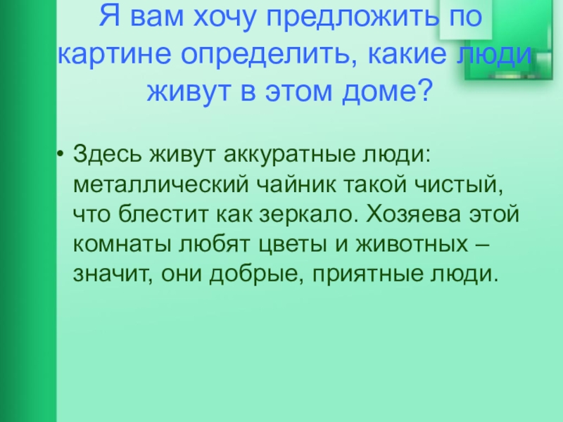 Здесь живут аккуратные люди: металлический чайник такой чистый, что блестит как зеркало. Хозяева этой комнаты любят цветы и животных – значит, они добрые, приятные люди.