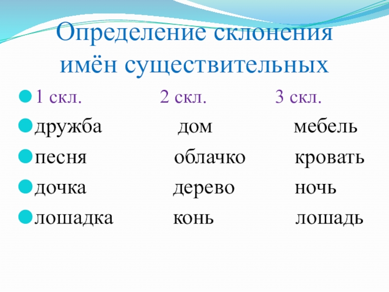 Определение склонения имён существительныхДом, мебель, дружба, кровать, облачко, песня, ночь, дерево, дочка, конь, лошадь, лошадка.