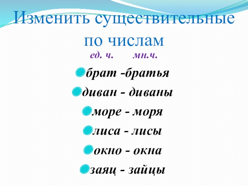 Изменить существительные  по числамед.ч.     мн.ч.братдиванморелисаокнозаяц