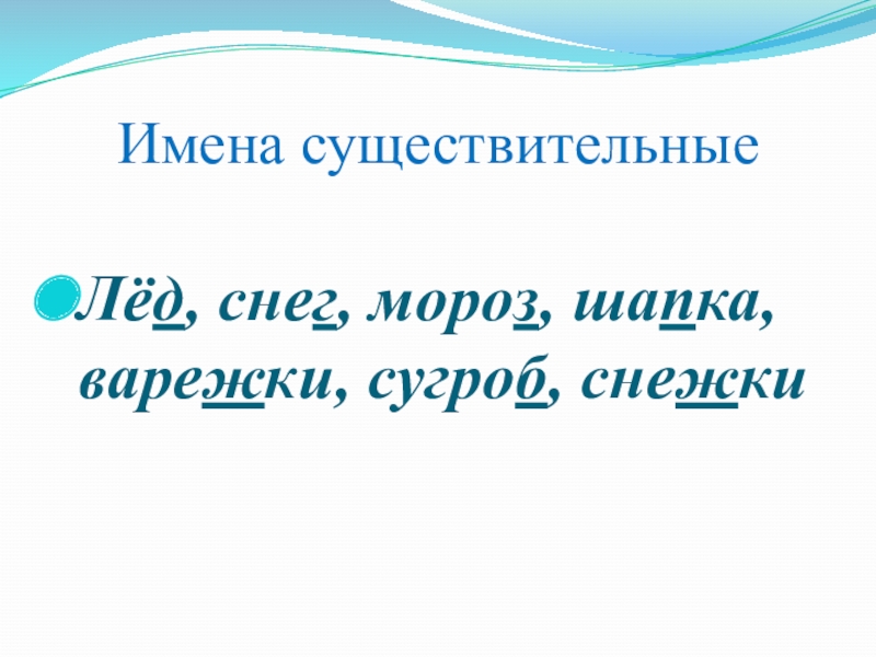 Имена существительныеЛёд, снег, мороз, шапка, варежки, сугроб, снежки
