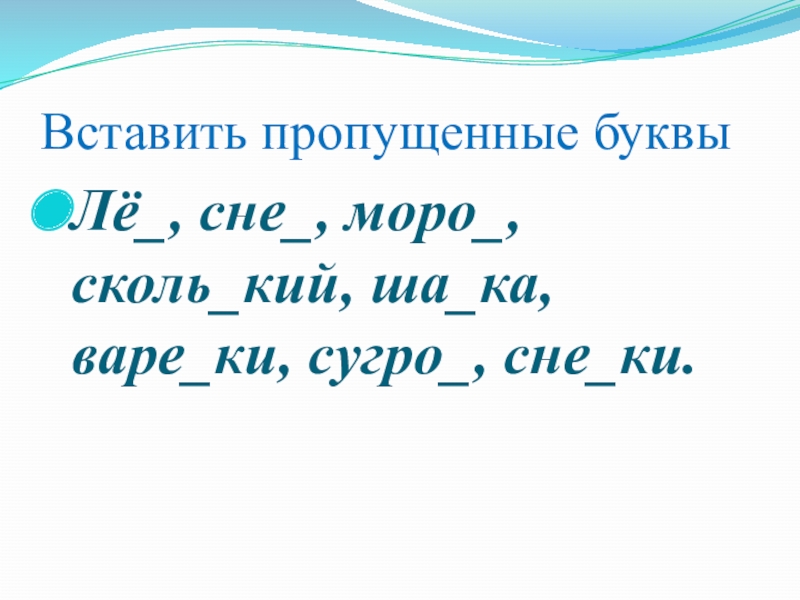 Вставить пропущенные буквыЛё_, сне_, моро_, сколь_кий, ша_ка, варе_ки, сугро_, сне_ки.