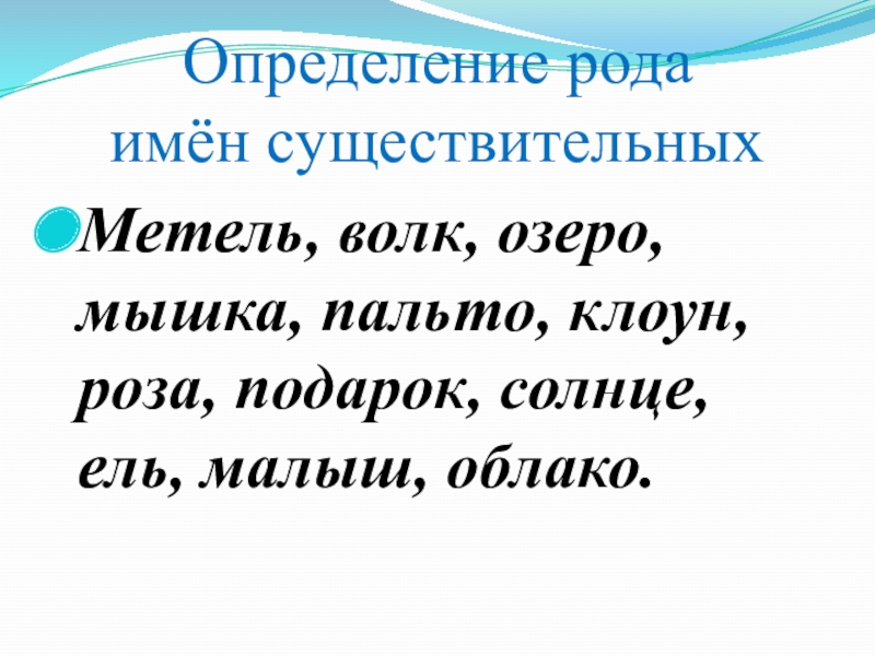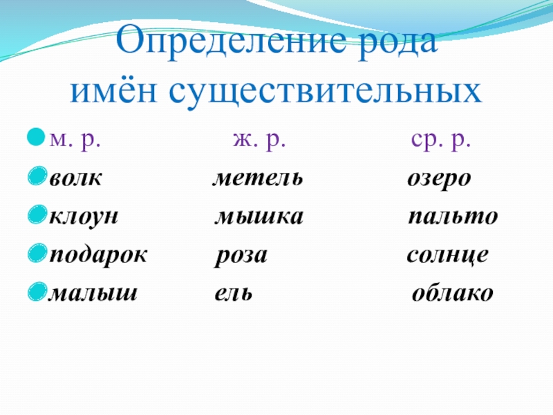 Определение рода  имён существительныхМетель, волк, озеро, мышка, пальто, клоун, роза, подарок, солнце, ель, малыш, облако.