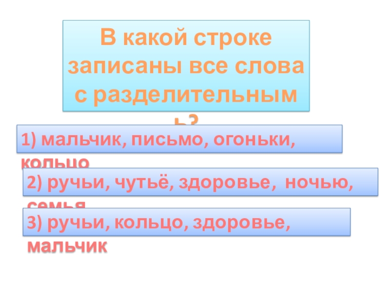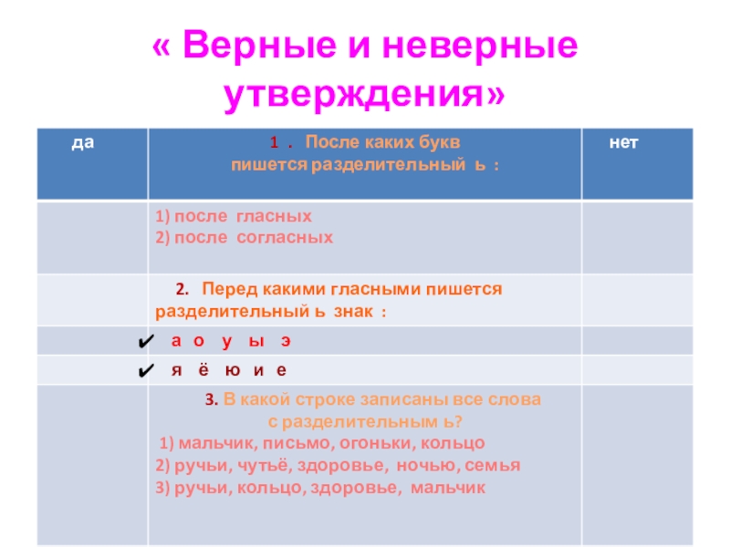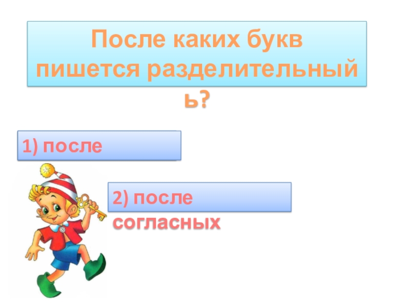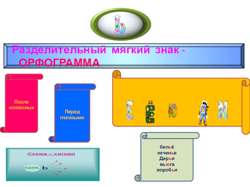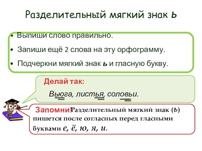 Разделительный мягкий знак (ь) пишется после согласных перед гласными буквами е, ё, ю, я, и.