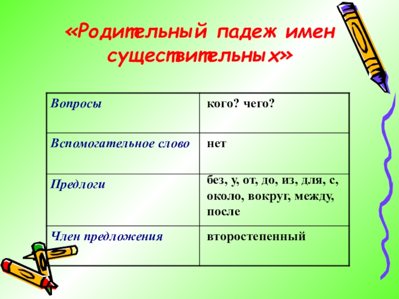 4) Предлоги этого падежа: ОТ, ДЛЯ, БЕЗ, ИЗ, У ______.