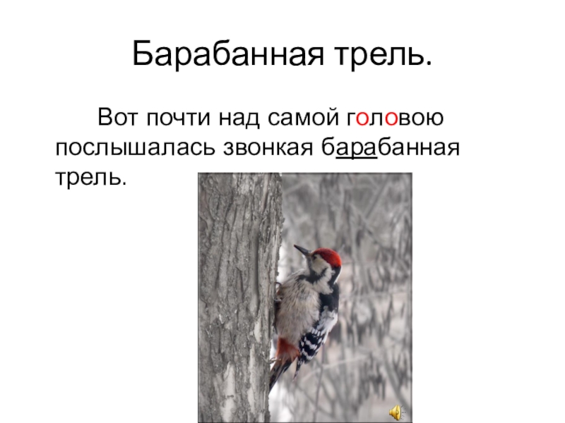 Это долбит по сухому дереву лесной музыкант – пёстрый дятел. Издалека доносятся звуки других барабанов. Так барабанщики - дятлы приветствуют приход весны.