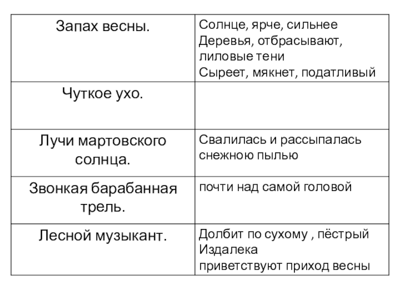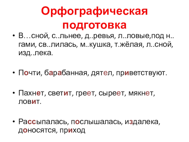 Орфографическая подготовкаВ…сной, с..льнее, д..ревья, л..ловые,под н..гами, св..лилась, м..кушка, т.жёлая, л..сной, изд..лека.Почти, барабанная, дятел, приветствуют.Пахнет, светит, греет, сыреет,