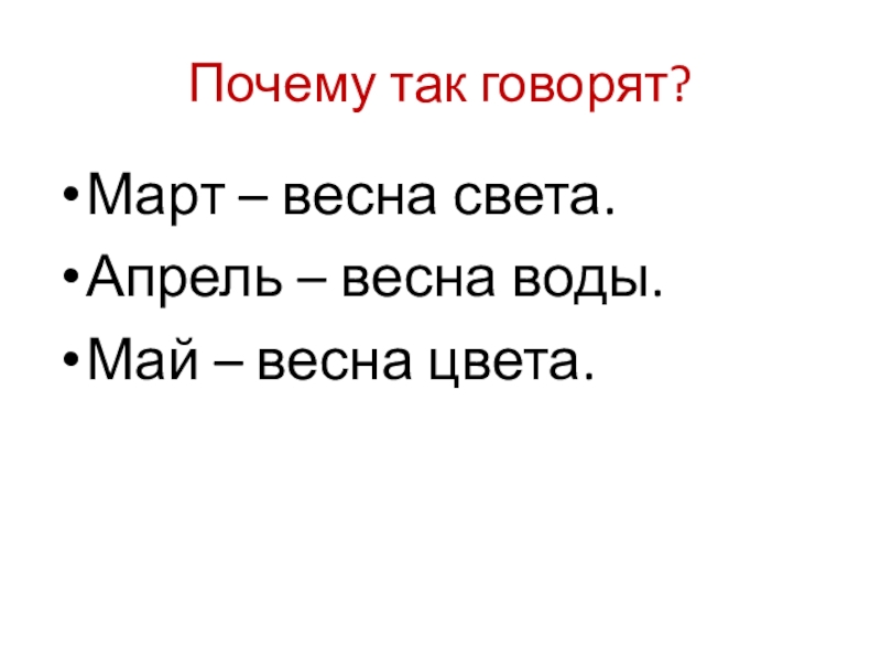 Почему так говорят?Март – весна света.Апрель – весна воды.Май – весна цвета.