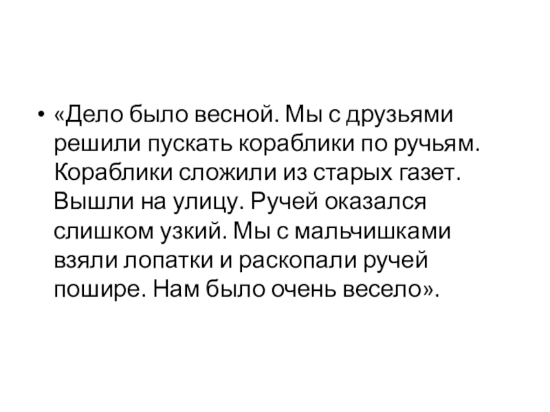 Слайд 6«Дело было весной. Мы с друзьями решили пускать кораблики по ручьям.