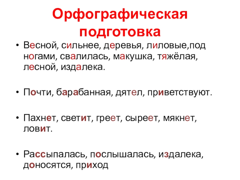 Орфографическая подготовкаВесной, сильнее, деревья, лиловые,под ногами, свалилась, макушка, тяжёлая, лесной, издалека.Почти, барабанная, дятел, приветствуют.Пахнет, светит, греет, сыреет,