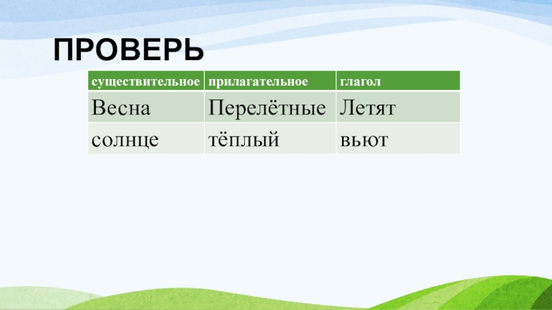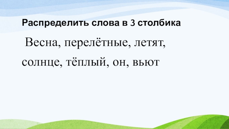 Распределить слова в 3 столбика Весна, перелётные, летят,солнце, тёплый, он, вьют