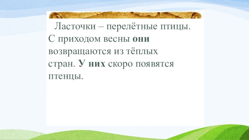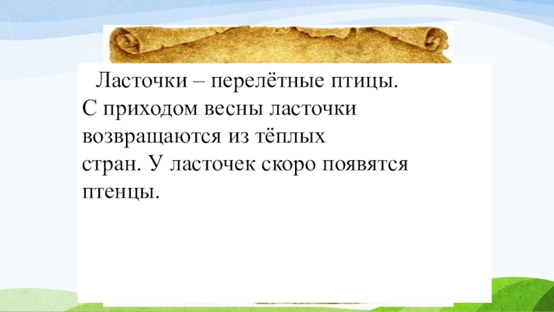Ласточки – перелётные птицы. С приходом весны ласточки возвращаются из тёплых стран. У ласточек скоро