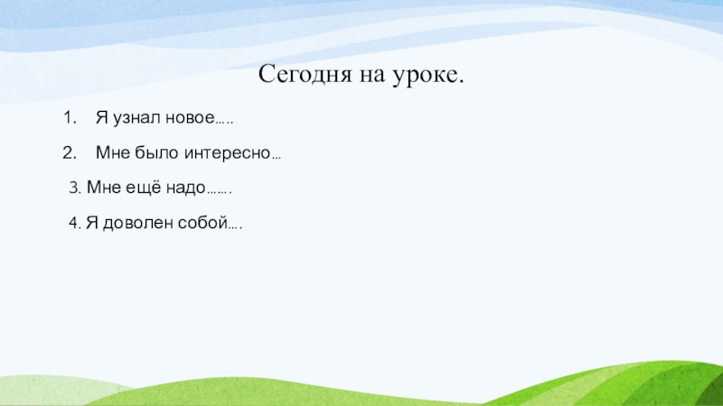 Сегодня на уроке.Я узнал новое…..Мне было интересно…3. Мне ещё надо…….4. Я доволен собой….
