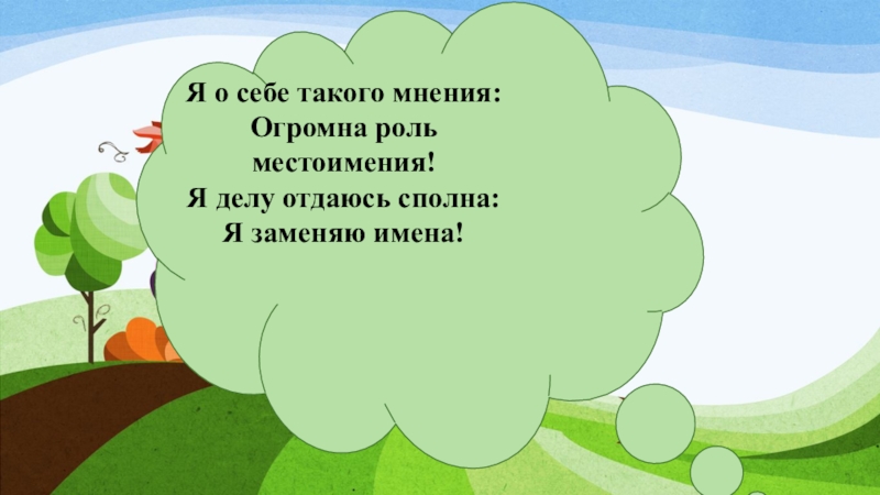 Я о себе такого мнения:Огромна роль местоимения!Я делу отдаюсь сполна:Я заменяю имена!