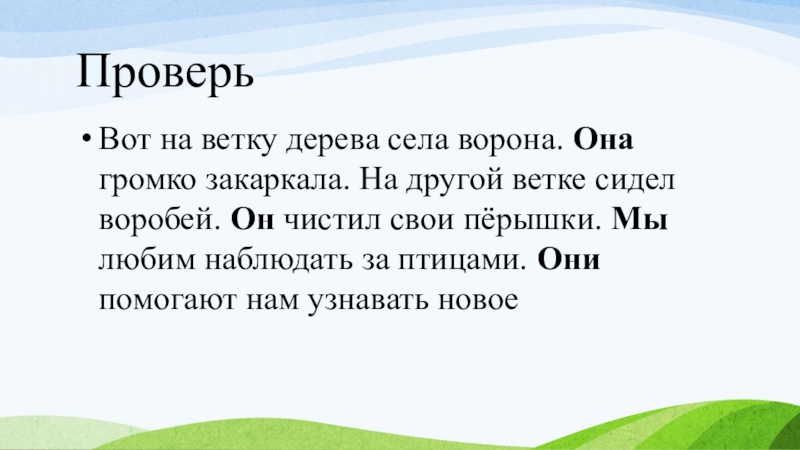 ПроверьВот на ветку дерева села ворона. Она громко закаркала. На другой ветке сидел воробей. Он чистил свои