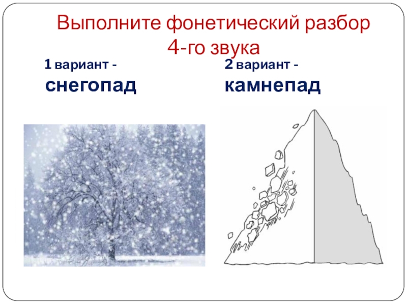 Выполните фонетический разбор 4-го звука1 вариант - снегопад2 вариант - камнепад