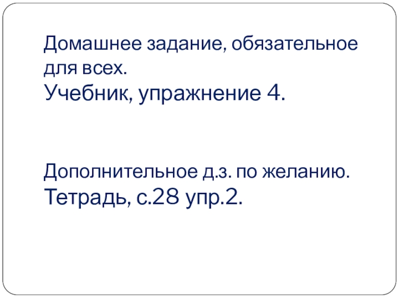 Слайд 24Домашнее задание, обязательное для всех. Учебник, упражнение 4. Дополнительное д.з. по желанию. Тетрадь, с.28