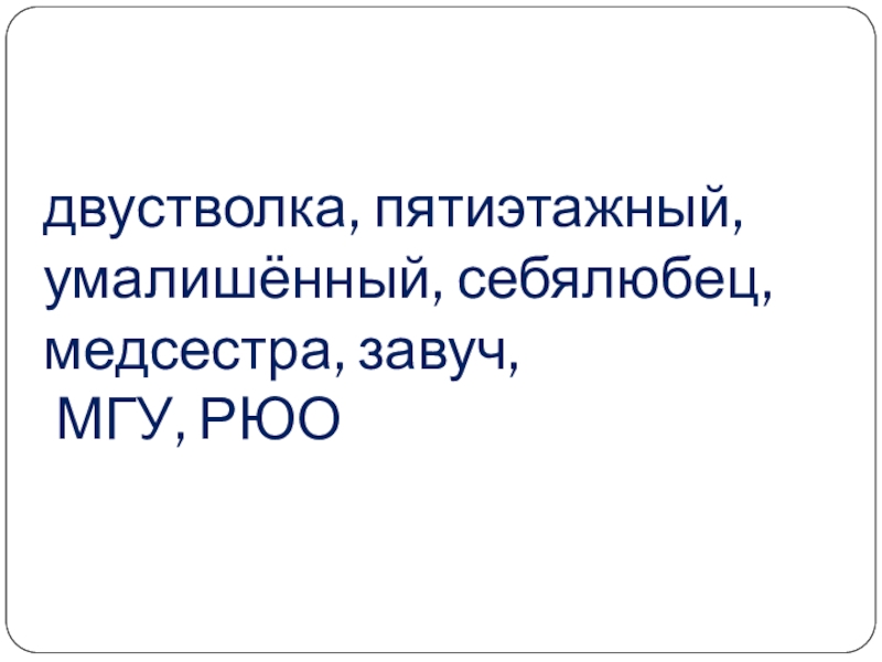 Слайд 22двустволка, пятиэтажный, умалишённый, себялюбец, медсестра, завуч, МГУ, РЮО