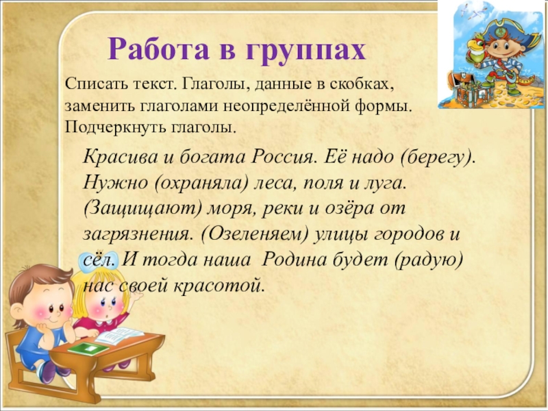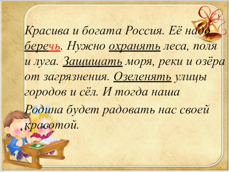 Красива и богата Россия. Её надо (берегу). Нужно (охраняла) леса, поля и луга. (Защищают) моря, реки и озёра от загрязнения. (Озеленяем) улицы городов и сёл. И тогда наша Родина будет (радую) нас своей красотой.