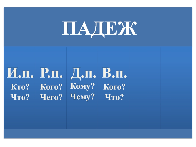 ПАДЕЖИ.п.Кто?Что?Р.п.Кого?Чего?Д.п.Кому?Чему?В.п.Кого?Что?