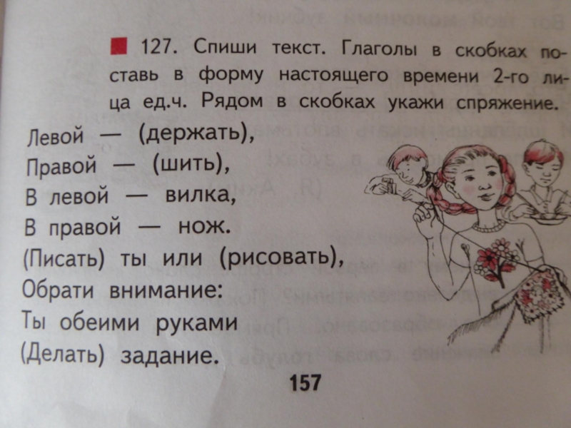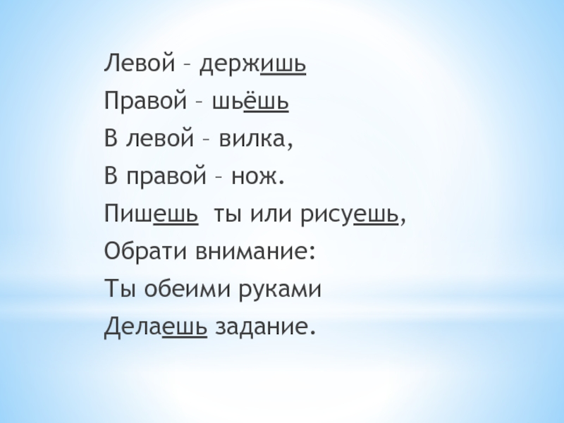 Левой – держишь 	Правой – шьёшь 	В левой – вилка,	В правой – нож.	Пишешь ты или рисуешь, 	Обрати
