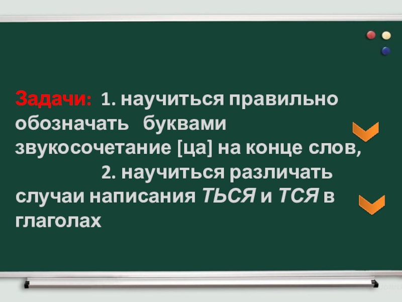 Слайд 10Задачи: 1. научиться правильно обозначать буквами звукосочетание [ца] на конце