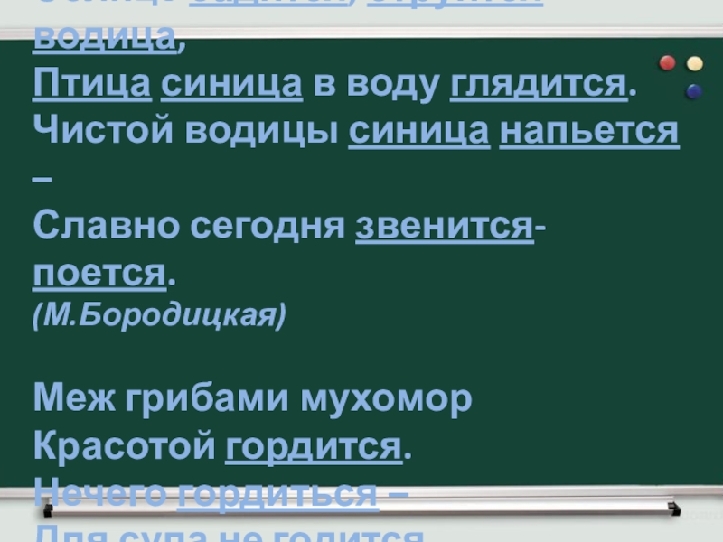 – Славно сегодня звенится-поется. (М.Бородицкая) Меж грибами мухомор Красотой гордится. Нечего гордиться – Для супа не годится.