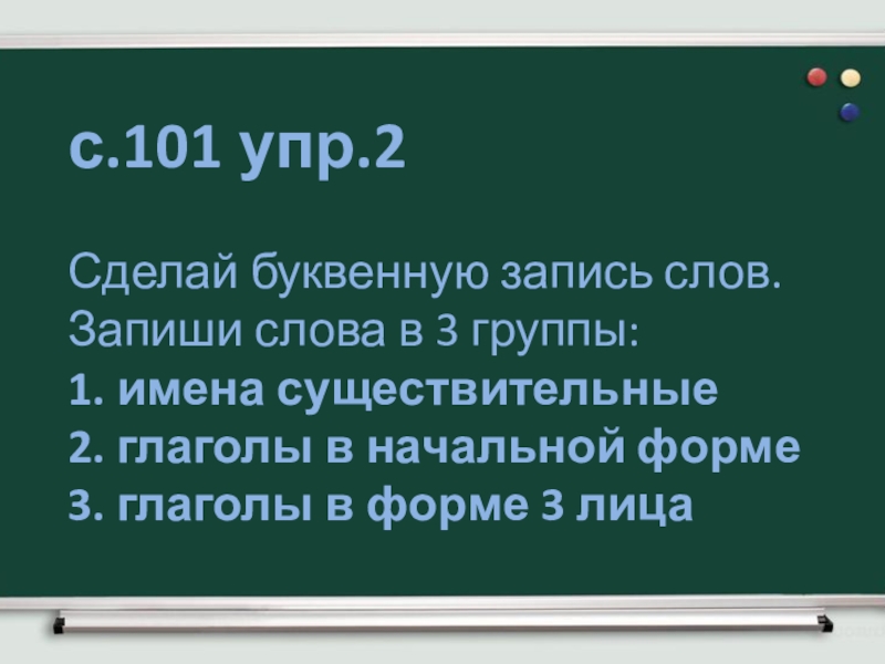 с.101 упр.2  Сделай буквенную запись слов. Запиши слова в 3 группы: 1. имена существительные 2. глаголы