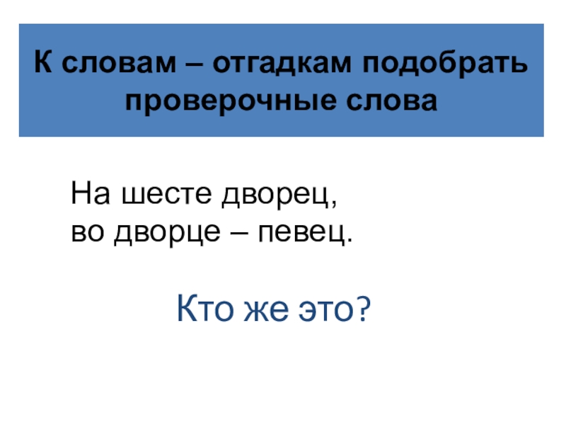 К словам – отгадкам подобрать проверочные слова   На шесте дворец,  во дворце – певец.Кто