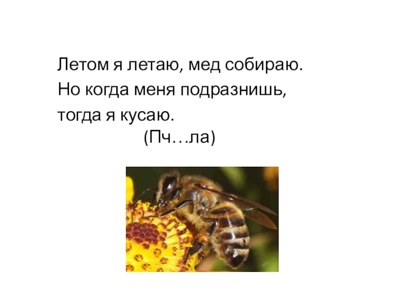 Летом я летаю, мед собираю.Но когда меня подразнишь,тогда я кусаю. (Пч…ла)
