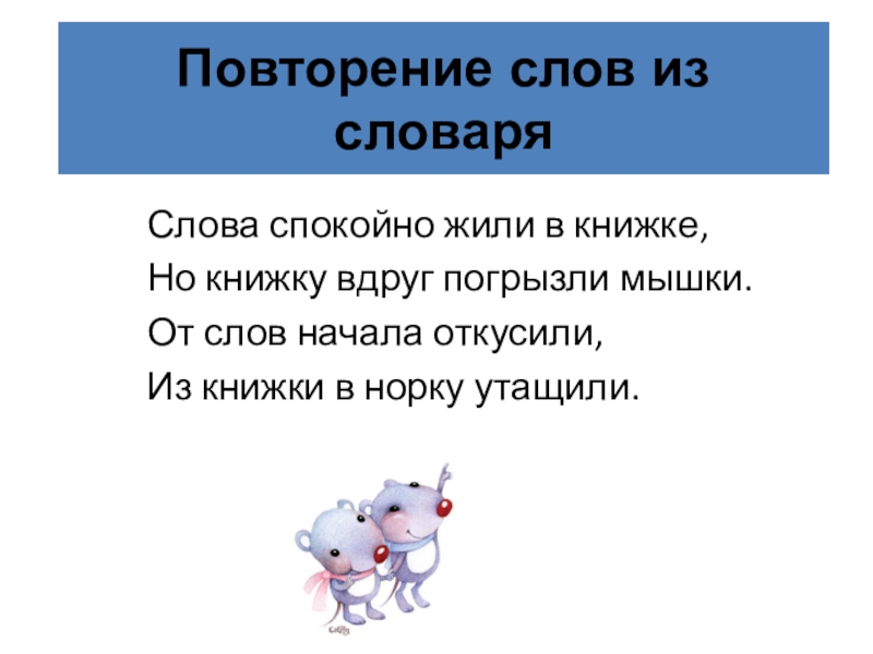 Повторение слов из словаряСлова спокойно жили в книжке,Но книжку вдруг погрызли мышки.От слов начала откусили,Из книжки в