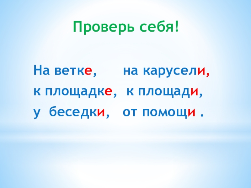 Проверь себя!    На ветке,   на карусели,    к площадке, к