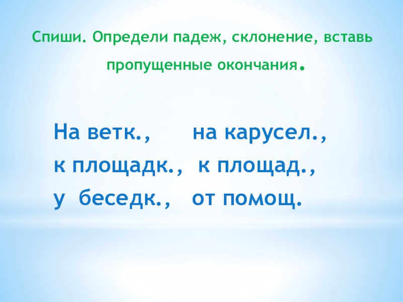 Спиши. Определи падеж, склонение, вставь пропущенные окончания.    На ветк.,   на карусел.,