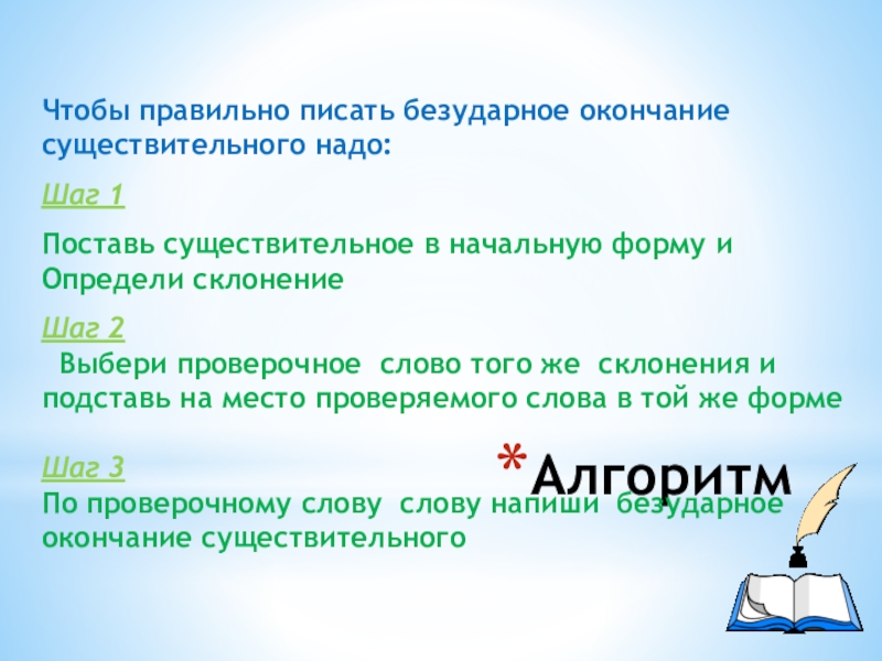 АлгоритмЧтобы правильно писать безударное окончание существительного надо:Шаг 1Поставь существительное в начальную форму и Определи склонение Шаг 2