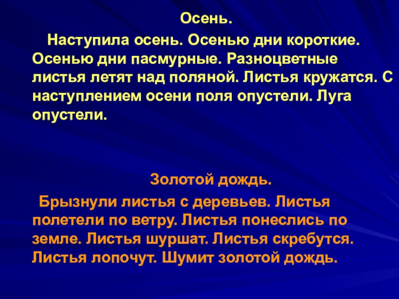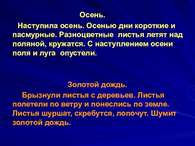 Наступила осень. Осенью дни короткие и пасмурные. Разноцветные листья летят над поляной, кружатся. С наступлением осени поля и луга опустели.