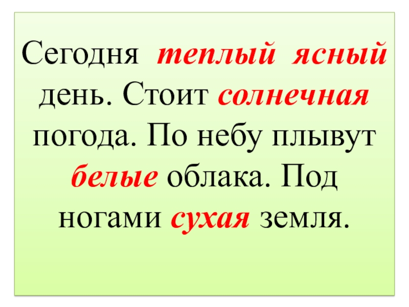 Слайд 15 Сегодня теплый ясный день. Стоит солнечная погода. По небу плывут белые
