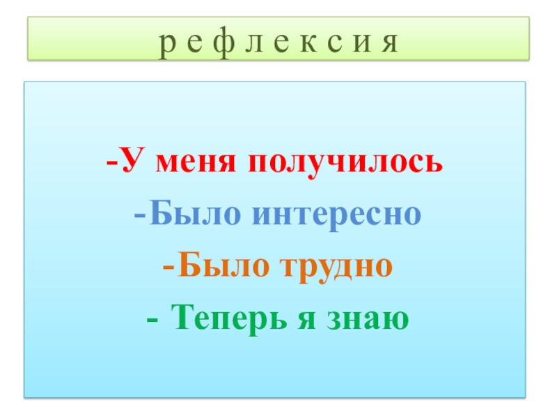 р е ф л е к с и я-У меня получилосьБыло интересноБыло трудно Теперь я знаю