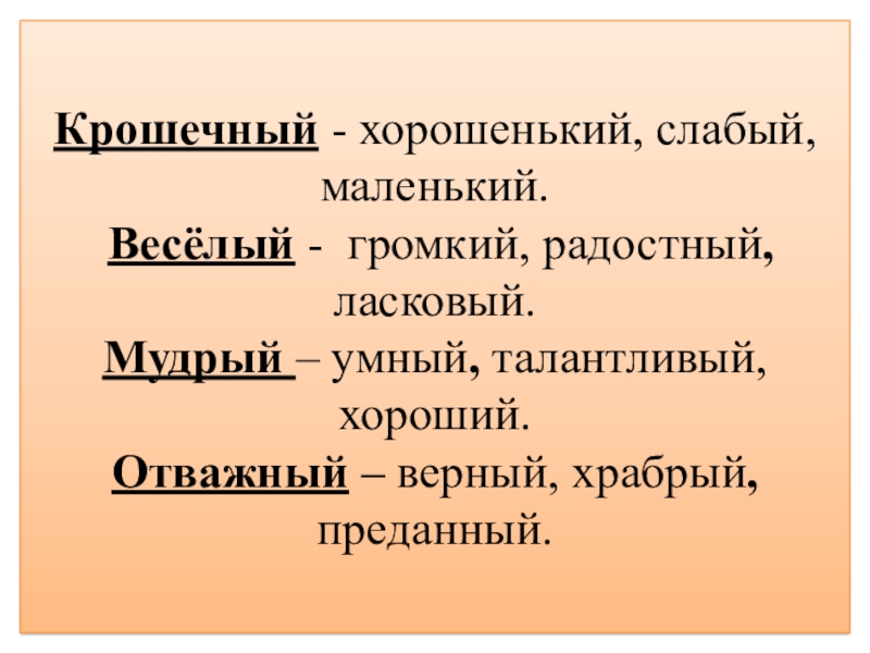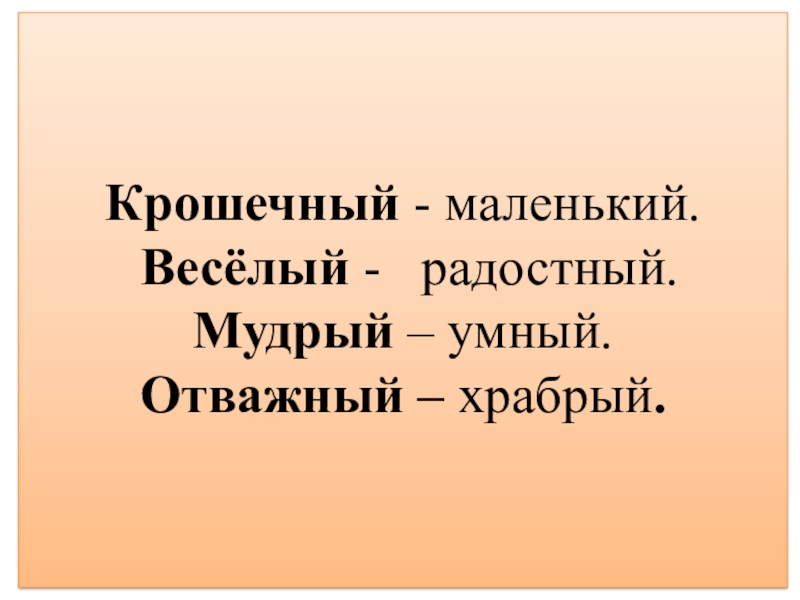 Слайд 8 Крошечный - маленький. Весёлый - радостный. Мудрый – умный. Отважный – храбрый.