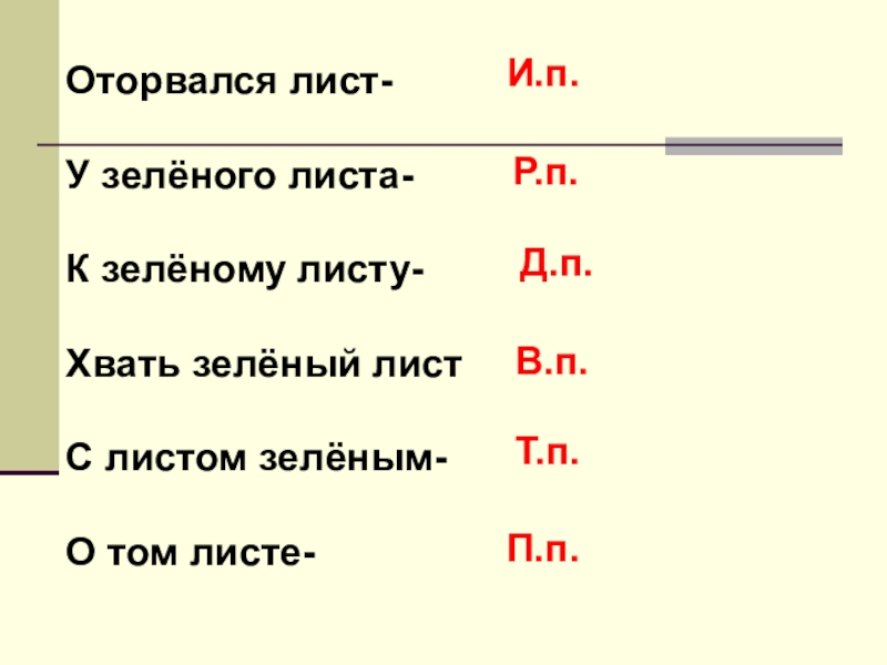 Оторвался лист-У зелёного листа-К зелёному листу-Хвать зелёный листС листом зелёным-О том листе-И.п.Р.п.Д.п.В.п.Т.п.П.п.