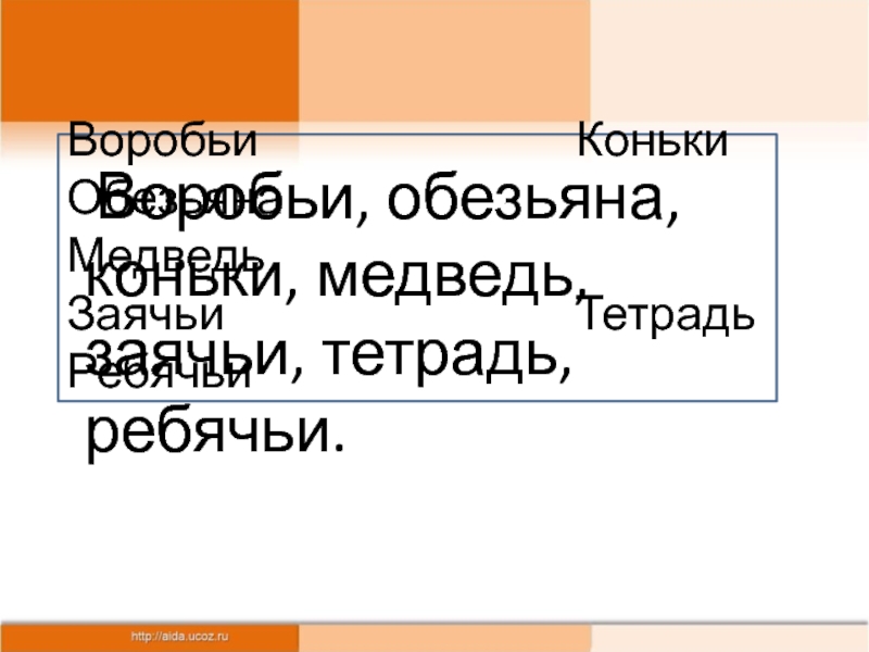 Слайд 7 Воробьи, обезьяна, коньки, медведь, заячьи, тетрадь, ребячьи.