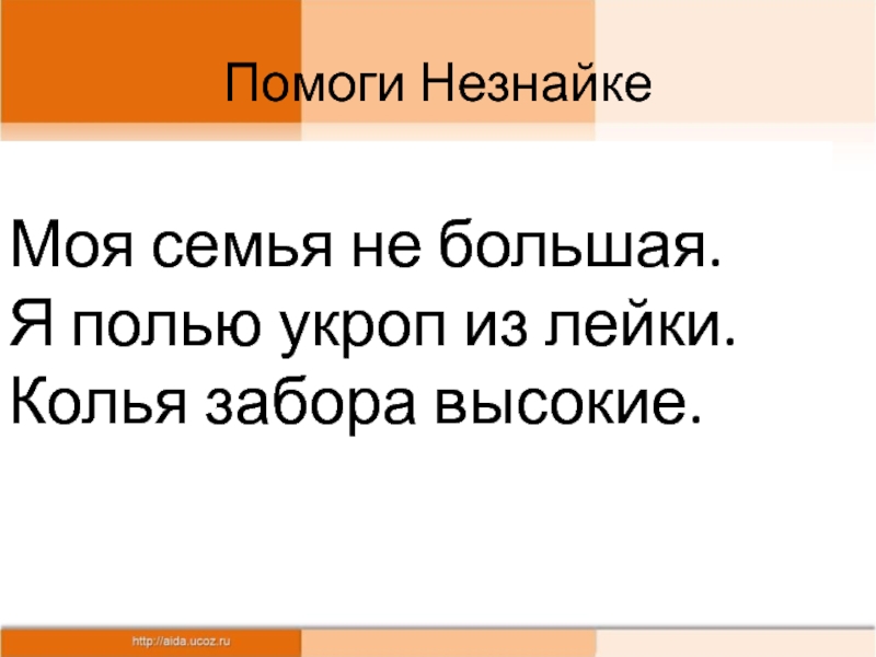 Помоги НезнайкеМоя семя не большая.Я полю укроп из лейки.Коля забора острые.Моя семья не большая.Я полью укроп из