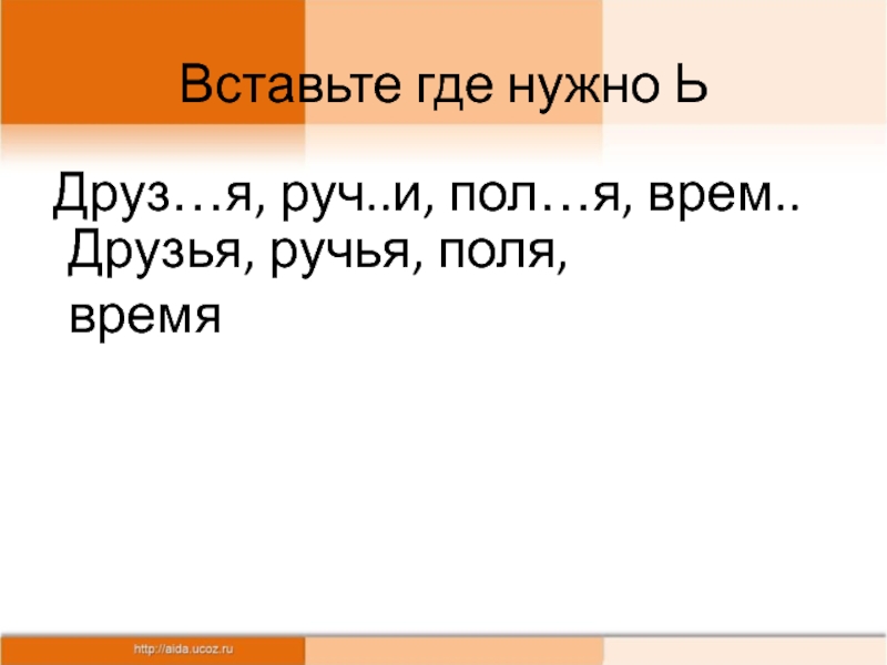 Вставьте где нужно ЬДруз…я, руч..и, пол…я, врем..я.Друзья, ручья, поля, время..