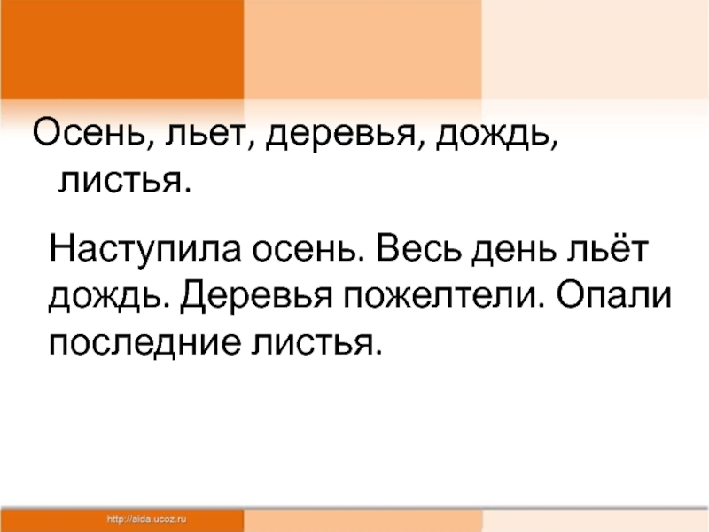 Наступила осень. Весь день льёт дождь. Деревья пожелтели. Опали последние листья.Осень, льет, деревья, дождь, листья.