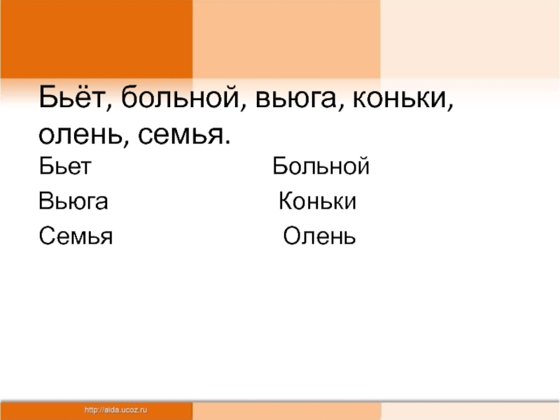 Слайд 3 Бьёт, больной, вьюга, коньки, олень, семья.