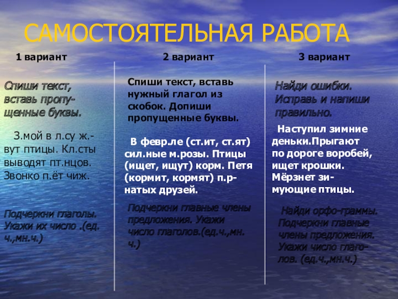 Найди орфо-граммы.Подчеркни главные члены предложения. Укажи число глаго-лов. (ед.ч.,мн.ч.)