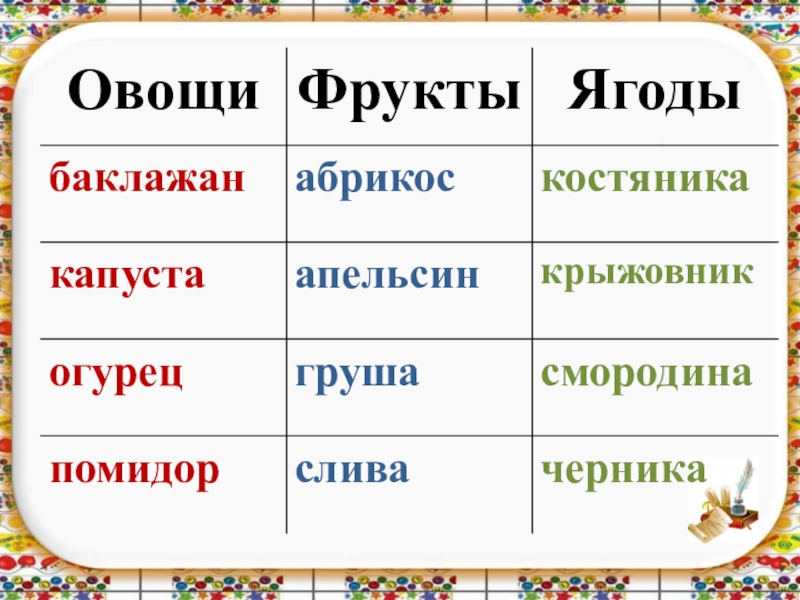 Смородина, абрикос, помидор, капуста, крыжовник, груша, черника, баклажан, апельсин, костяника, огурец, слива