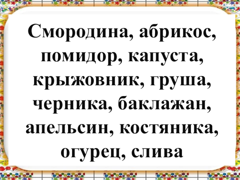 Слайд 10Смородина, абрикос, помидор, капуста, крыжовник, груша, черника, баклажан, апельсин, костяника, огурец,