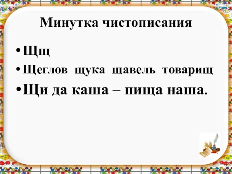 Минутка чистописанияЩщЩеглов щука щавель товарищЩи да каша – пища наша.