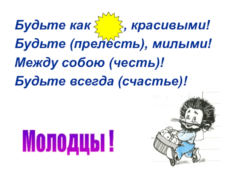 Будьте как     , красивыми!Будьте (прелесть), милыми!Между собою (честь)!Будьте всегда (счастье)!Молодцы !