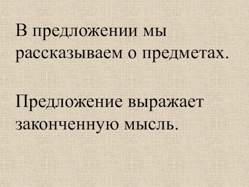 В предложении мы рассказываем о предметах. Предложение выражает законченную мысль.